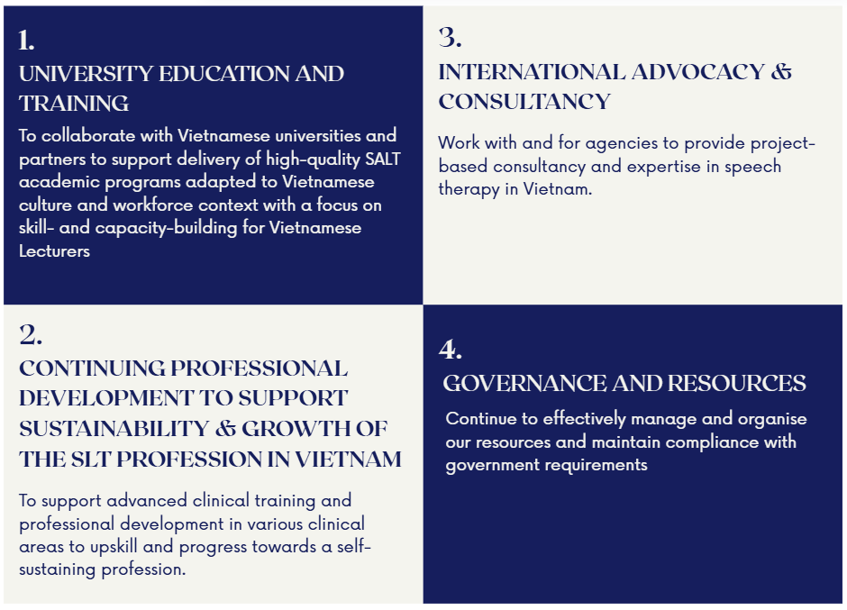 To collaborate with Vietnamese universities and speech and language therapists to strengthen and sustain the Speech and Language Therapy profession across Vietnam.
